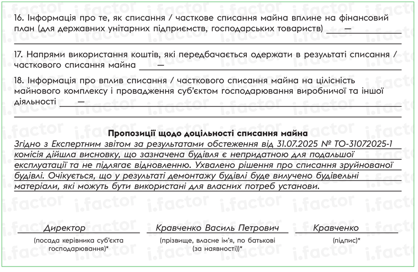 3) пропозиції щодо доцільності списання майна.