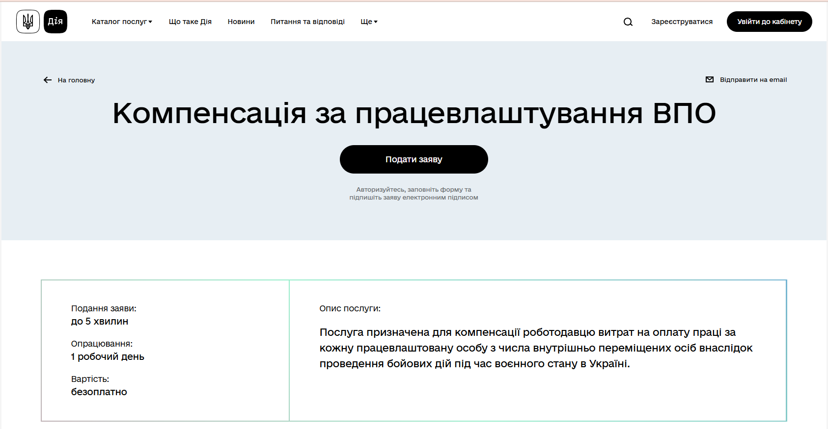 Оформити компенсацію за працевлаштування ВПО можна на порталі Дія.
