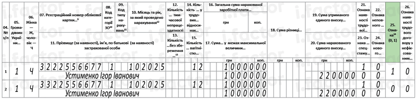 - Для виправлення помилки в податковому номері, а також усіх несумових помилок, крім П. І. Б. працюючого працівника, застосовується єдиний принцип: виключення помилкового рядка (ознака «1») та введення правильного рядка (ознака «0»).