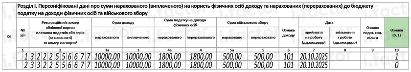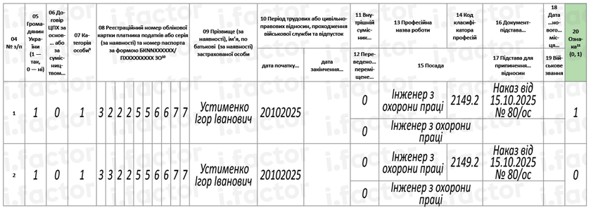 Приклад. Працівника прийнято на роботу 20.10.2025. Помилково за жовтень 2025 року замість правильного податкового номера 3322556677 вказано 3222556677. Помилка за жовтень виправляється у грудні 2025 року (після граничного строку подання звіту за жовтень 2025 року).