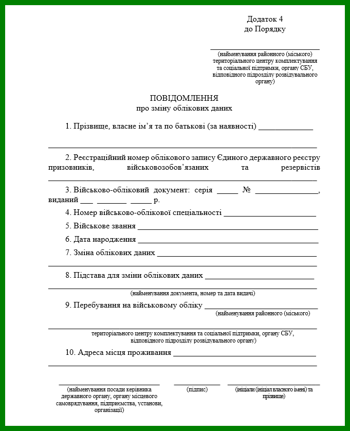 - Щомісяця до 5 числа подають до відповідного ТЦК Повідомлення про зміну облікових даних (додаток 4 до Порядку № 1487 – рис. нижче).