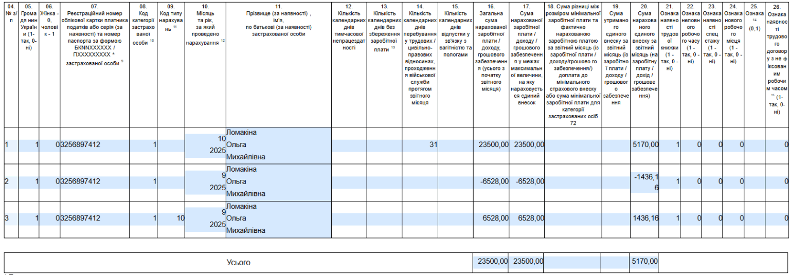 У графах 16 (сума нарахованої заробітної плати/доходу за звітний місяць) та 17 (сума нарахованої заробітної плати/доходу за звітний місяць, на яку нараховано єдиний внесок) внесіть зі знаком “мінус” суму відпускних, яка була помилково показана як зарплата.