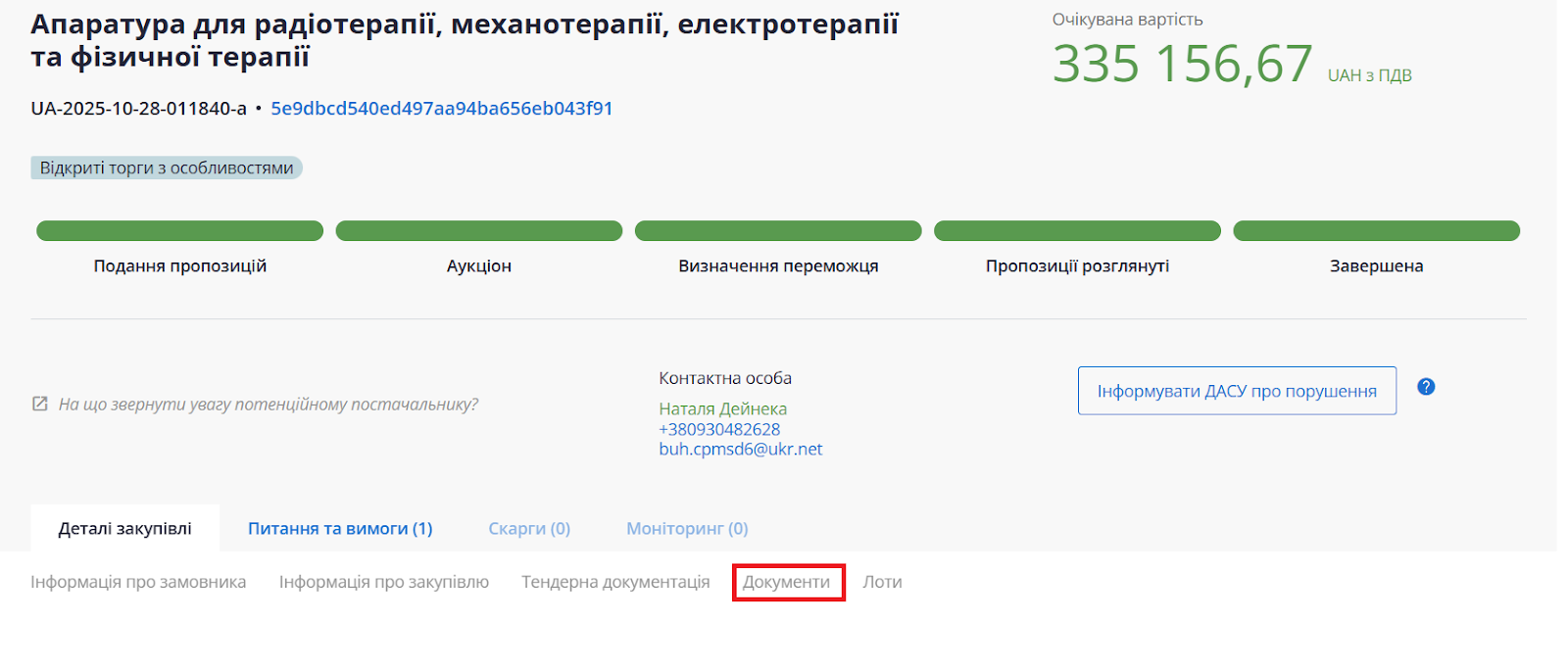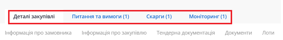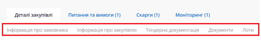 Зверніть увагу:якщо закупівля лотова (один і більше лотів), перехід за тегом «Лоти» прокручує сторінку до переліку лотів. Щоб переглянути деталі, потрібно розкрити рядок потрібного лоту.