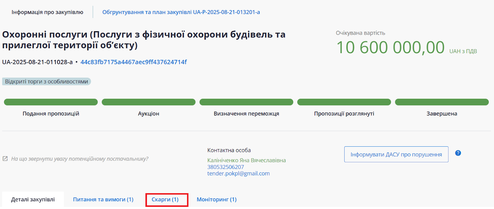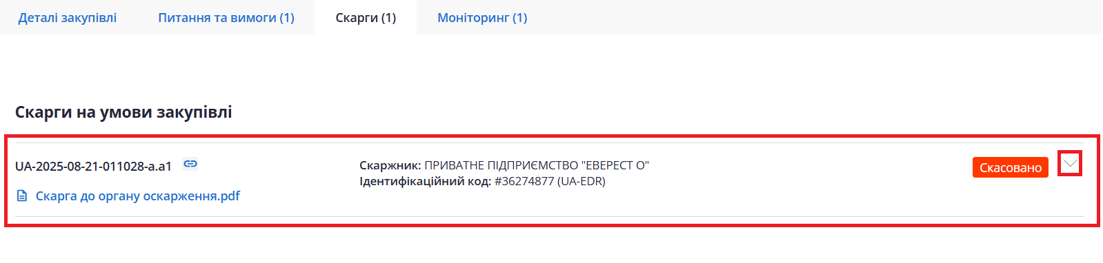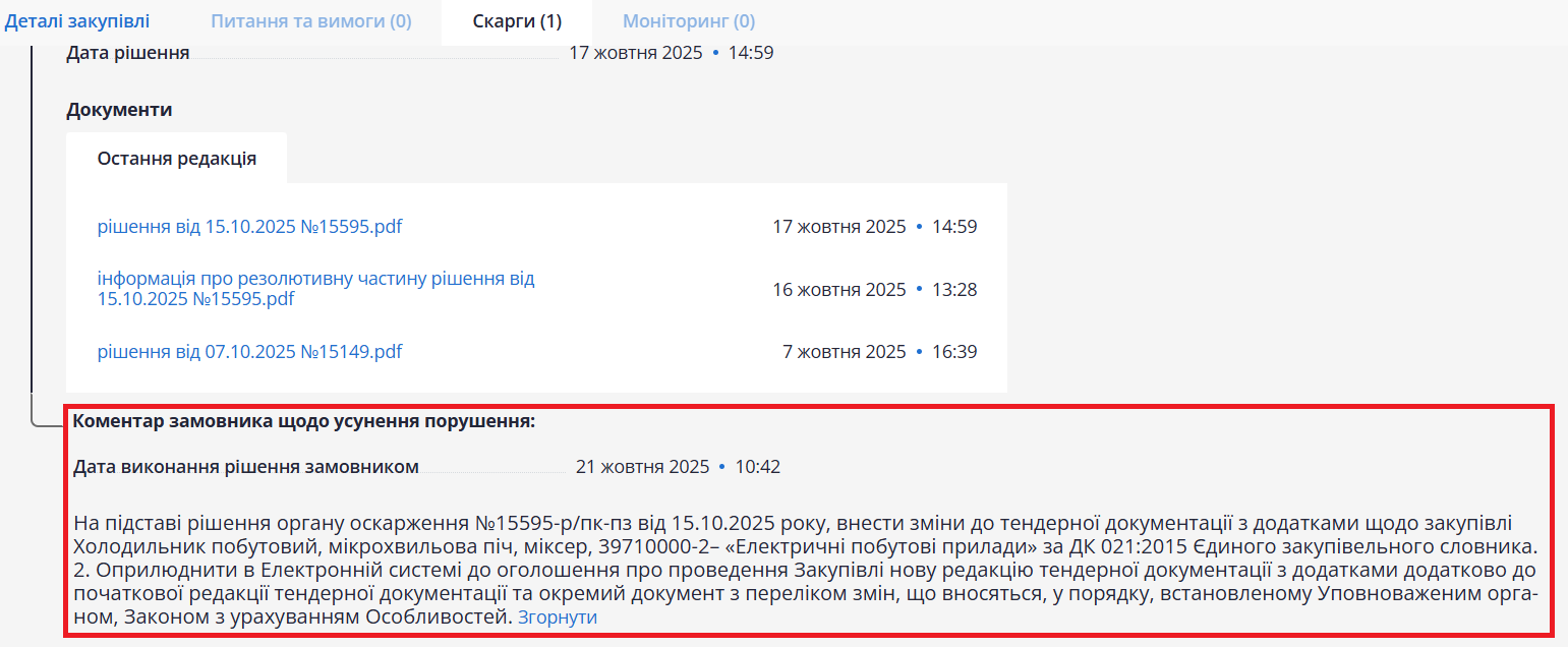 Внизу блоку «Скарги» міститься інформація про виконання рішення АМКУ замовником.
