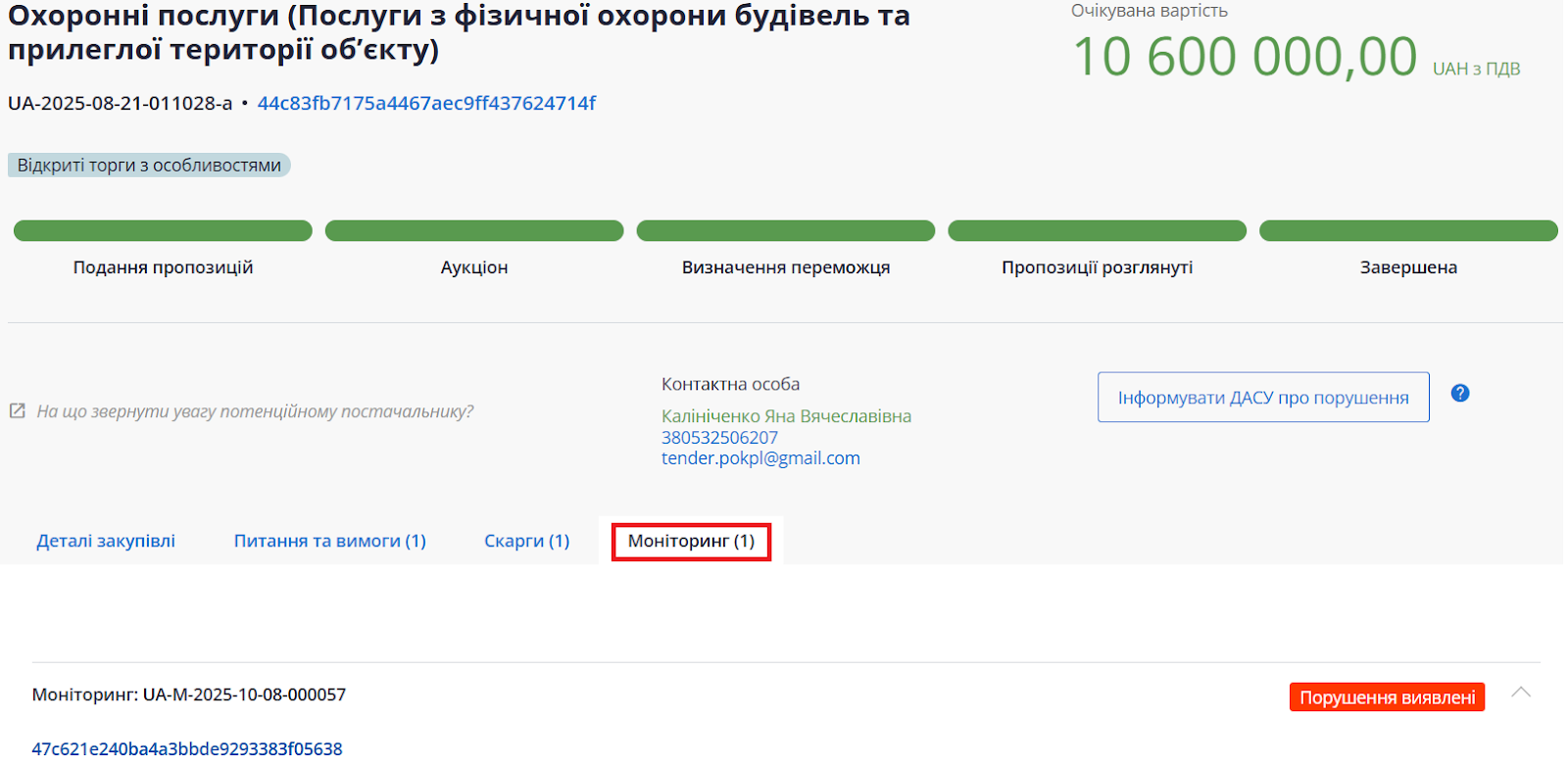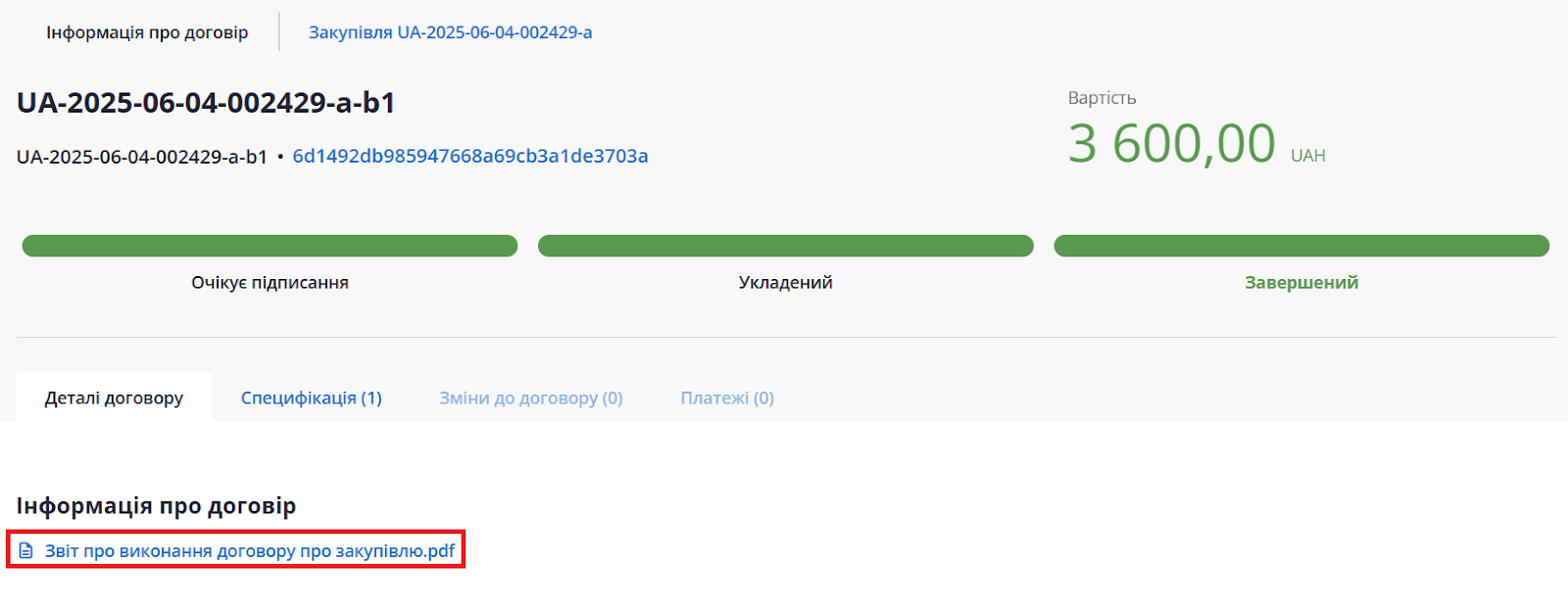 Звіт про виконання відображається на сторінці договору, лише коли замовник оприлюднив в системі звіт про його виконання/розірвання та статус договору перейшов з «укладений» на «завершений».