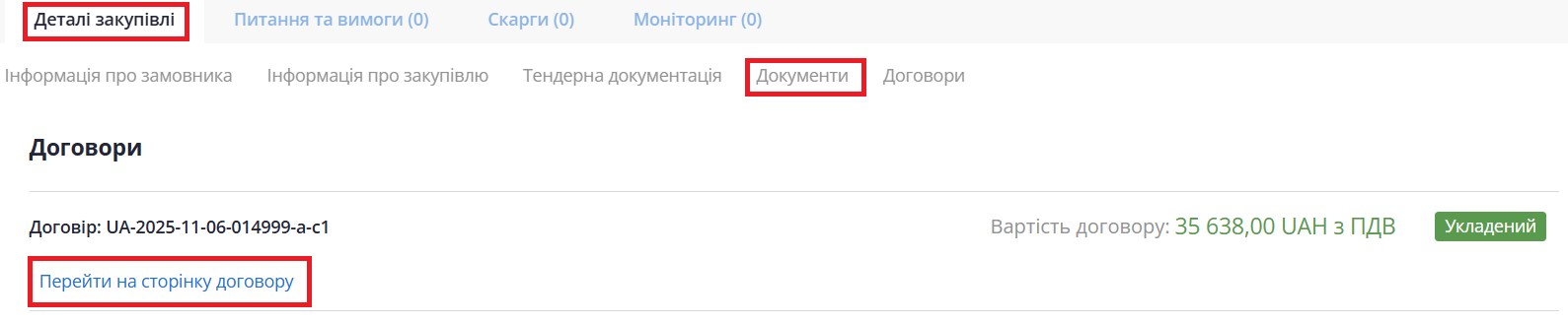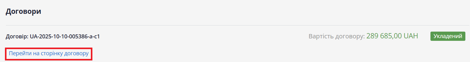 Щоб перейти на сторінку договору через закупівлю: у лотовій закупівлі натисніть на тег «Лоти», розгорніть його, прокрутіть сторінку вниз і перейдіть на сторінку договору.