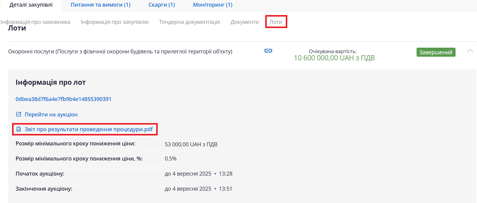 Звіт можна подивитись натиснувши на тег «Лоти» в блоці «Інформація про лоти» завантаживши звіт в один клік.