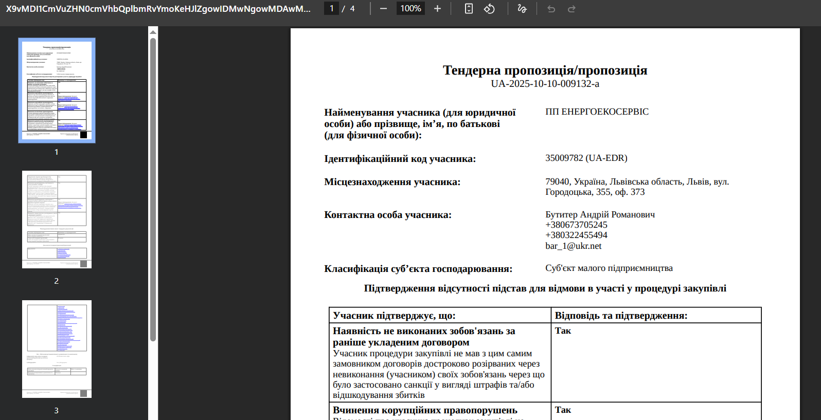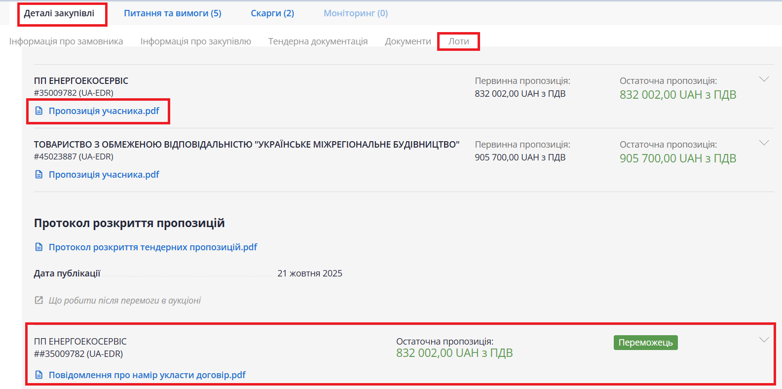 Знайдіть блок «Протокол розкриття пропозицій». Якщо закупівля має лоти, цей блок розміщується всередині кожного з них — відкрийте потрібний лот, щоб переглянути інформацію. Побачивши інформацію про переможця, відкрийте пропозицію цього учасника в один клік у додатковому вікні вашого браузера, натиснувши на файл у форматі PDF.