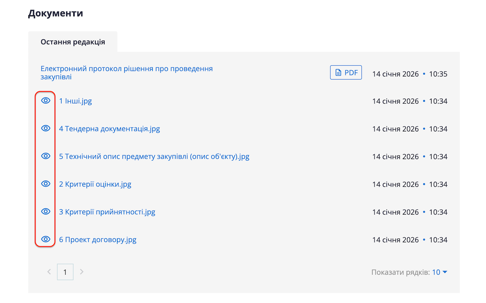 - Електронні протоколи: для протоколів, що формуються системою, все залишається без змін. Ви переглядаєте їх через звичну кнопку «PDF», додаткова іконка «ока» для них не додаватиметься.